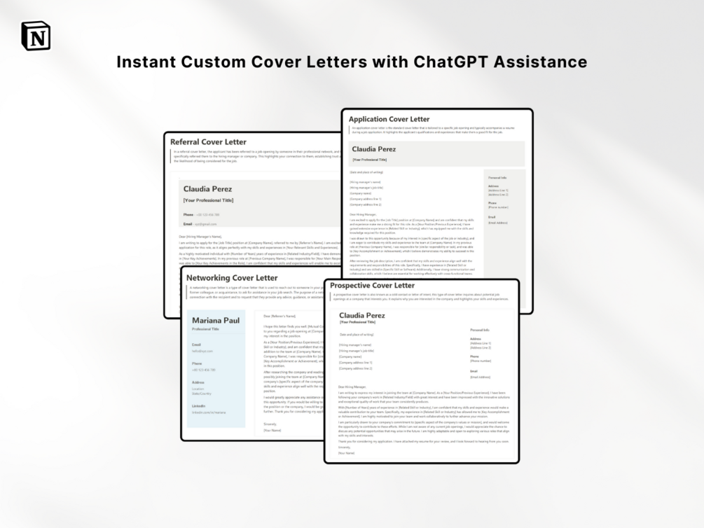 In addition to its layout options, the Resume Builder Kit also includes a variety of cover letter templates to help you make a great first impression. And with the help of ChatGPT prompts, you can create a custom letter in just seconds!